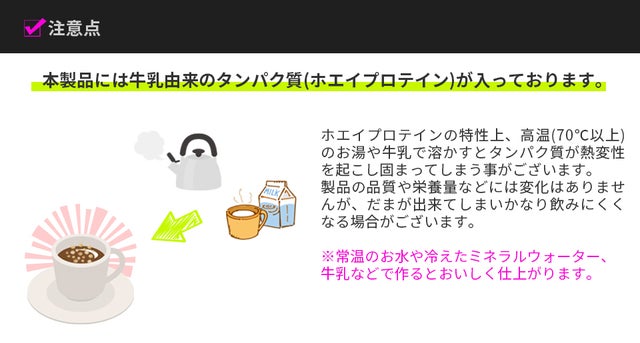 ※当商品はホエイプロテインを多く内包しております。ホエイプロテインの特性上、お湯で溶かしますとタンパク質が熱で凝固してしまいます。お作りになるときの温度に気を付けてください。およそ70℃以上で凝固してしまいます。