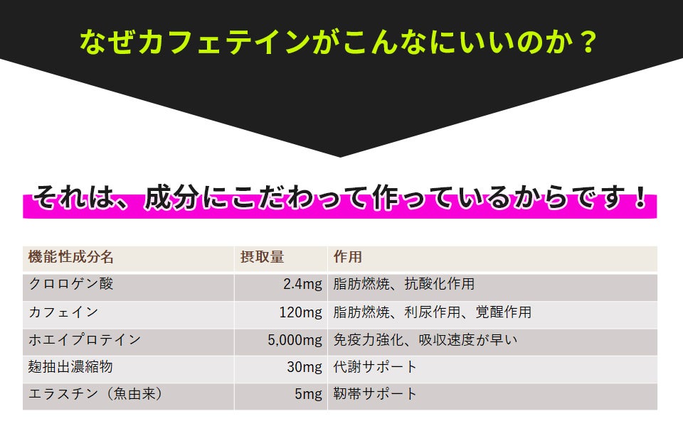 製品化する中で、機能性成分を他にもとれるようにしたいと思い、クロロゲン酸・カフェイン・ホエイプロテイン・酵素・エラスチンを配合させて頂きました。