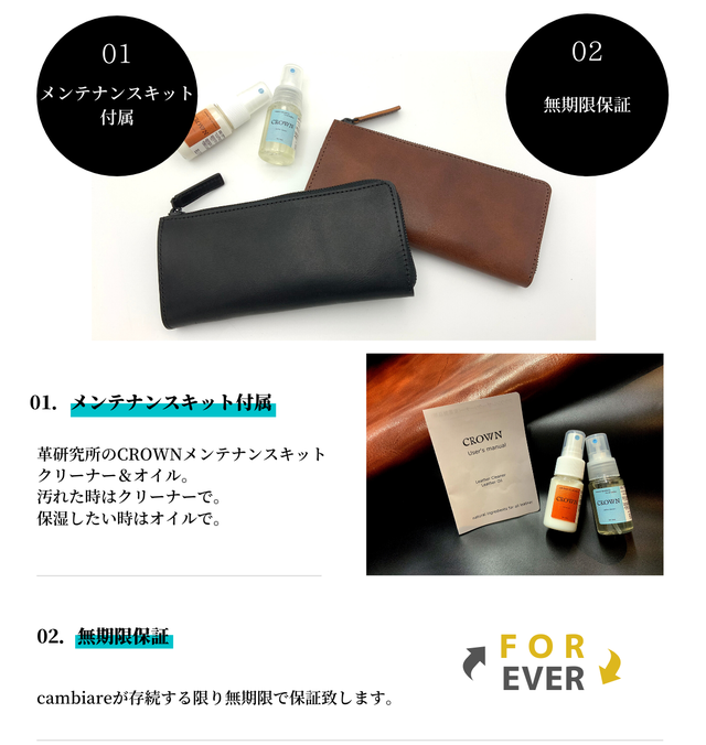 これらによって革は表情を変えていきます。だんだん色味が深くなり、艶が生まれてきます。また革の表情は1つ1つが違います。そのため、厳密に同じものは存在しません。オンリーワンだからこそ、末永く愛用して頂きたいという私達の想いから、メンテナンスキットの付属と無期限保障とさせて頂きました。