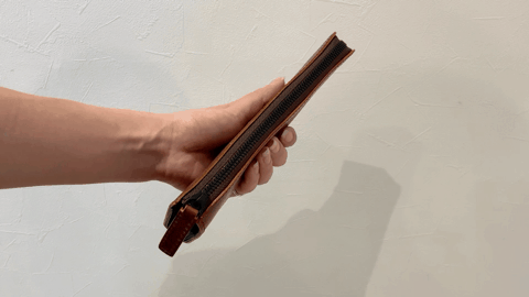 この財布は持つ時、置く時、開く時、閉める時、あらゆる場面に抜群のフィット感で手のひらに収まってくれます。このフィット感は従来の一般的な長財布よりも1.5cm小さくすることで生まれました。何度も試作を重ね、1mm単位で調整をして、お札が噛まない絶妙なサイズダウンに成功。