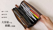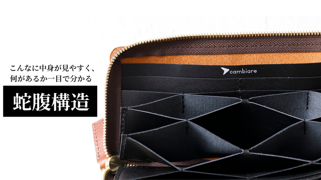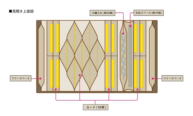 蛇腹部分を含めカードは19枚収納可能。大事なカード類は奥の人目につかないカード段へ収納できる嬉しさ。プライバシーもしっかり守ることができます。