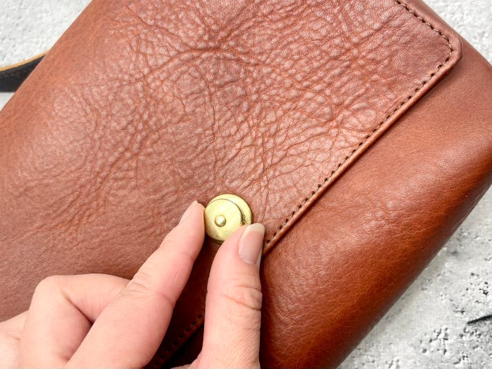 ドイツホック周辺の革を写真のように軽く押す。自然にカチャっとロックがかかります。また、開ける時と同じく、ホックの頭をつまみ上げながら元の位置に戻し、手を離すだけで閉まります。(ドイツホックの頭を押してしまうと、金具が噛み合わない場合があります。)