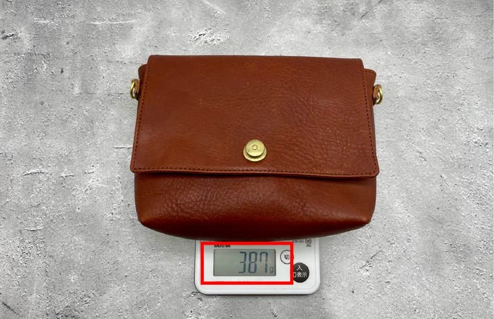 本革は重いイメージがあるかもしれませんが、この本革ミニショルダーは革の風合いを損なわないギリギリまで革の厚みを調整しました。そのため、本革ながら400gに満たない嬉しい軽さを実現しました。(ショルダー紐含む)