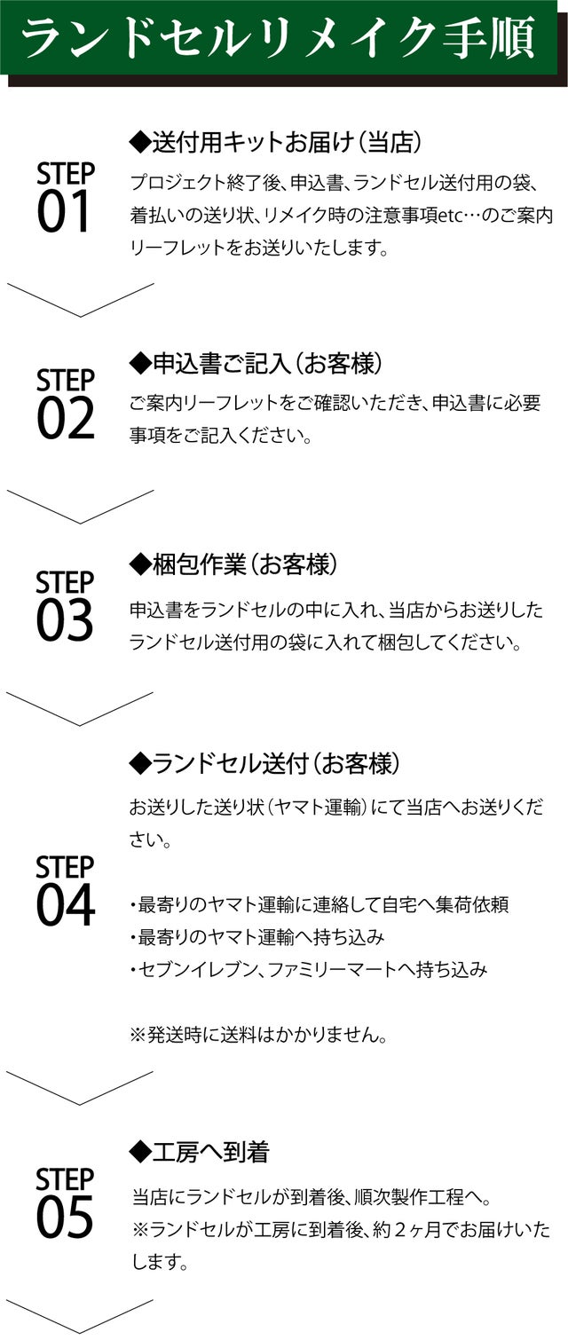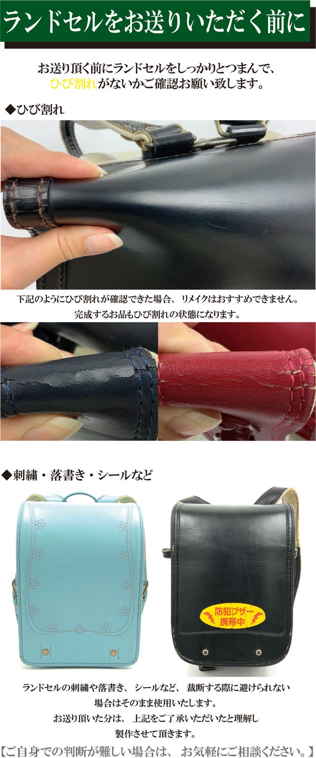 ※リメイク後のランドセルの返却は行っておりません。予めご了承のほどお願いいたします。