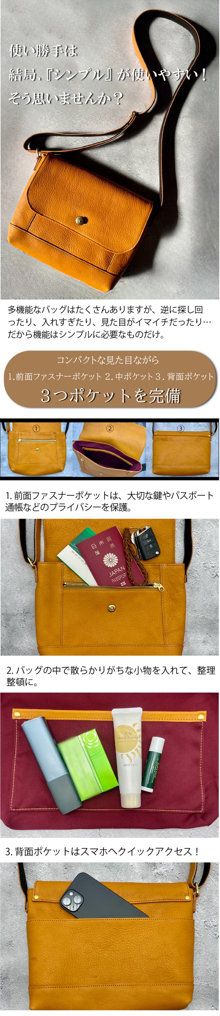 ビジネスシーン、普段使い、旅行など、どんな場面にもフィットする『あなたが育てるショルダーバッグ』です。