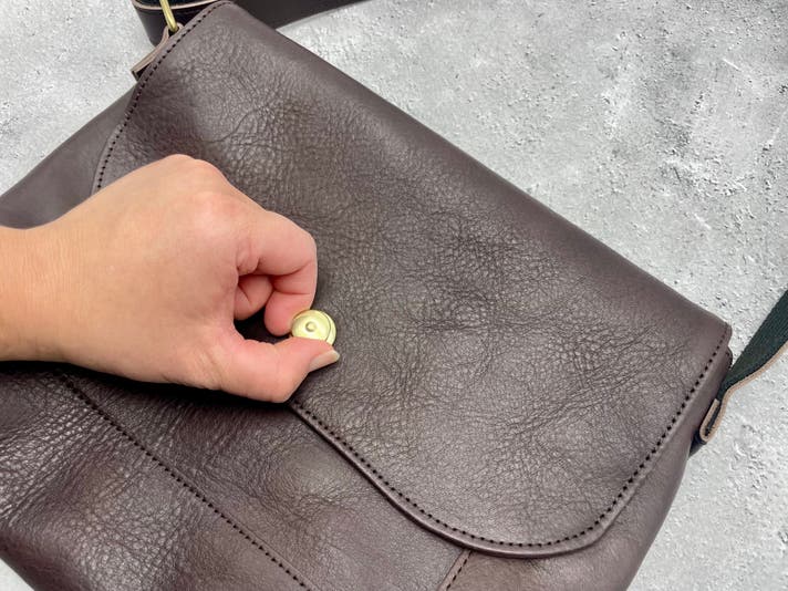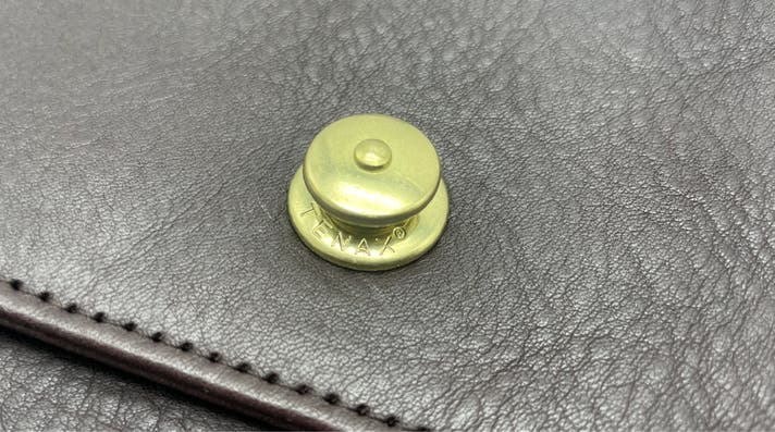 ドイツホック周辺の革を写真のように軽く押す。自然にカチャっとロックがかかります。また、開ける時と同じく、ホックの頭をつまみ上げながら元の位置に戻し、手を離すだけで閉まります。(ドイツホックの頭を押してしまうと、金具が噛み合わない場合があります。)
