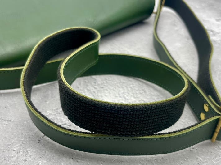 操作性と高級感を重視したショルダー紐は、革とアクリルテープのコンビ。