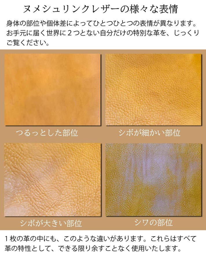 ヌメ本来の風合いと独特のシボ(しわ)としなやかさを兼ね備えた革です。