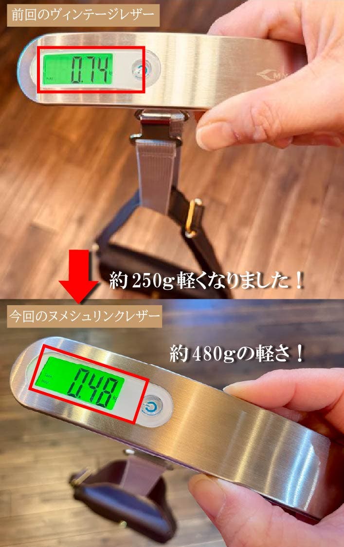 初回のヴィンテージショルダーより約250g軽くなり、約480gの軽さです。