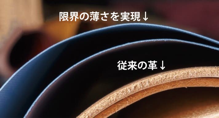 革をつくる際に軽さを出すためにオイル成分を極限まで減らすという特別な技法を用いたことと、もともとは2mmある革の厚みを革の雰囲気を損なわない限界まで薄くする漉き加工を施しました。