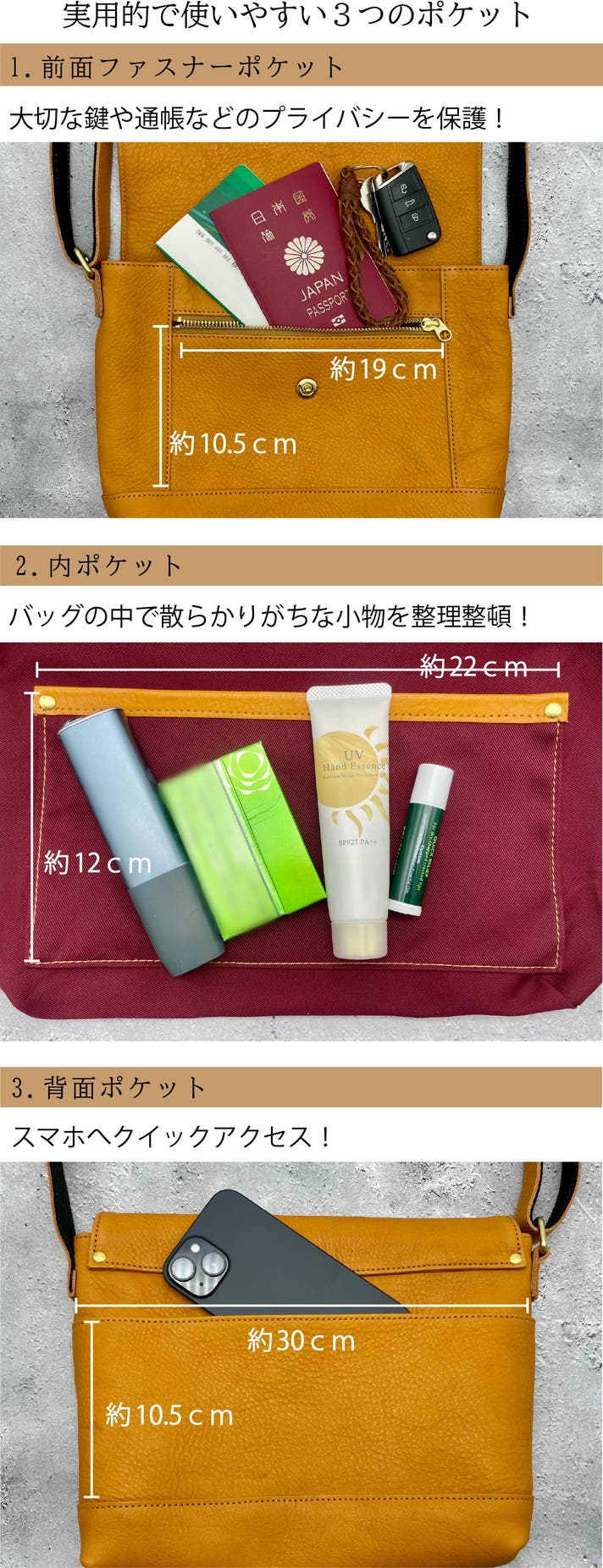 スマホと財布、小物を基本にプラスα、iPadや500mlペットボトル、折り畳み傘など収納可能です!