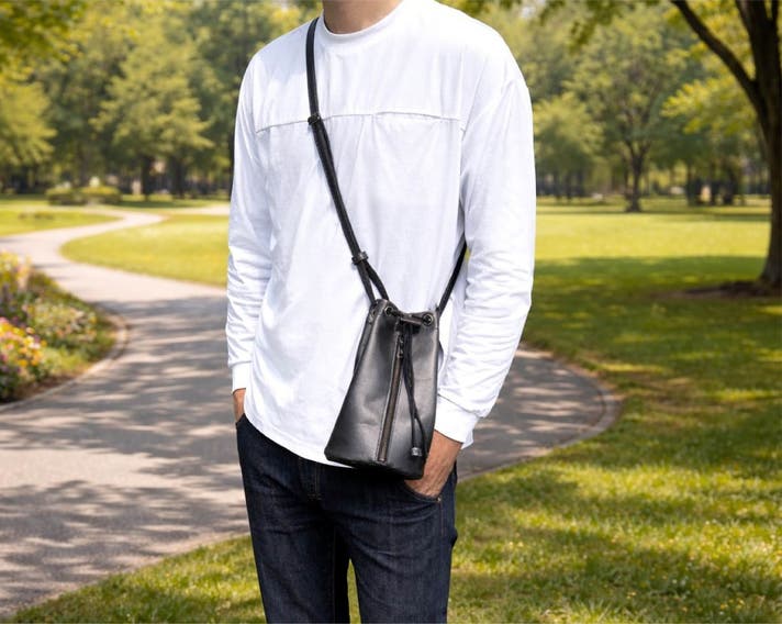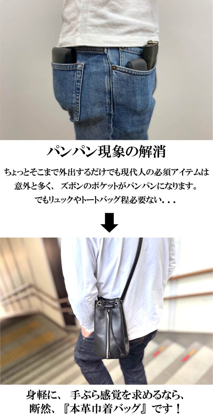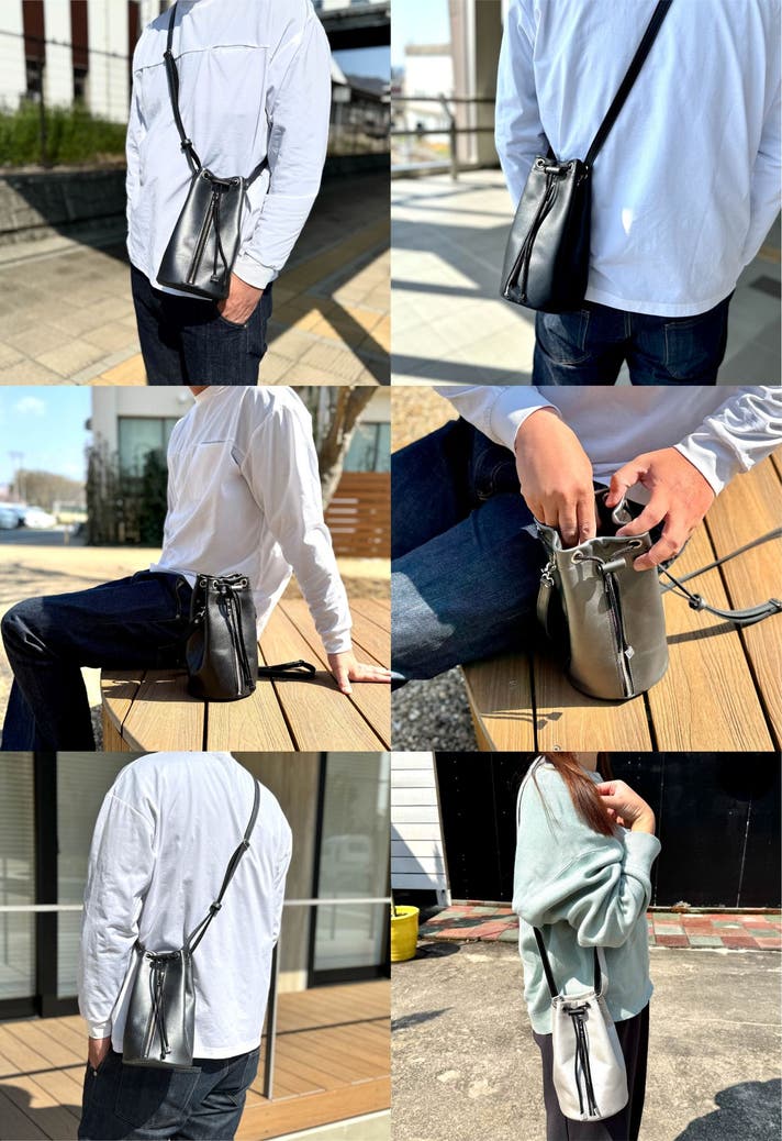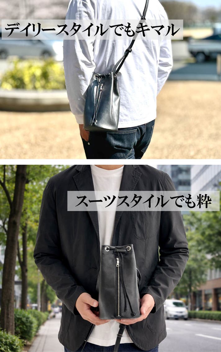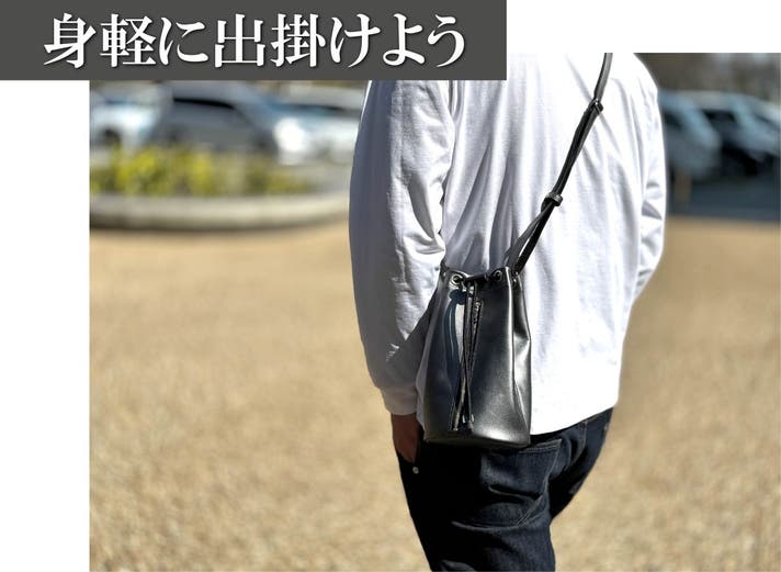 それが本革巾着バッグの魅力です。カジュアル感もありつつも、本革ならではの上品さと高級感を感じさせてくれる「本革巾着バッグ」は、大人のデイリーに嬉しく、どんな装いにもマッチしてくれます。まさに遊び心をくすぐる逸品です。