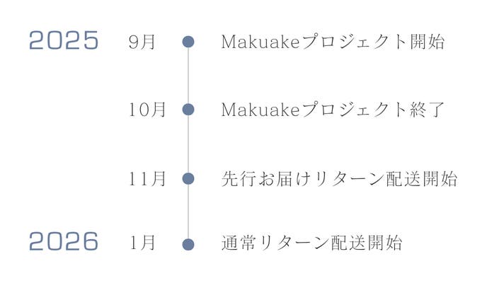 ※上記のスケジュールは、あくまでプロジェクト公開時点の予定です。応援購入の数が想定を上回った場合、製造工程上の都合により出荷時期が遅れる場合がございます。