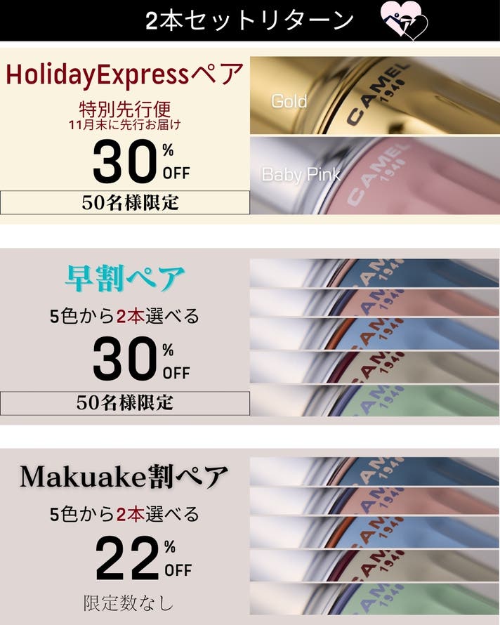【Makuake割ペア】5色から選べる2本セット 《22%OFF》