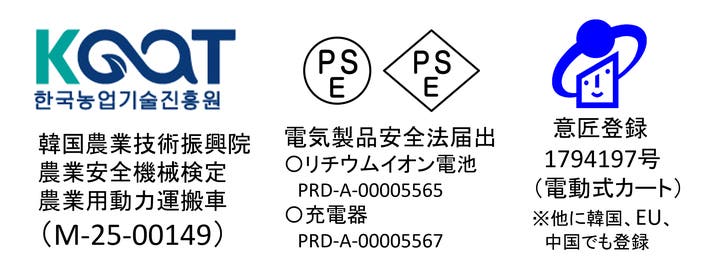 また、11.5度の傾斜面において、積載定量(150kg)の荷物を載せた状態で高さ120cmまでリフトを上昇させても、前後左右に転倒しない安定性を誇ります(韓国農業技術振興院「農業用動力運搬車 M25-00149号 検定成績」)。