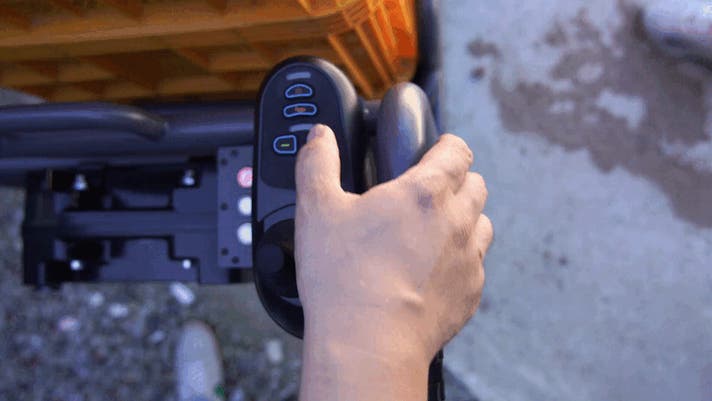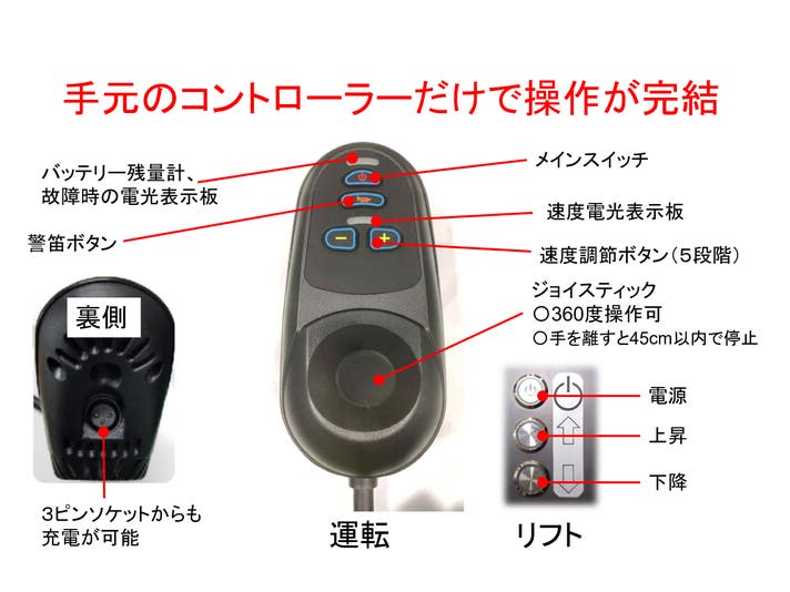 また、本体のON/OFF、速度調節、クラクションもジョイスティック前方のボタンで楽々操作。