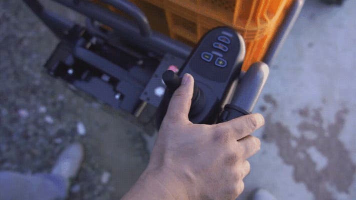 一般の台車と同様に両手で握り手を持って、右手の指を使ってジョイスティックを動かすことで動きます。直感的な操作が可能ですが、以下に類似品と操作が異なる部分を示します。