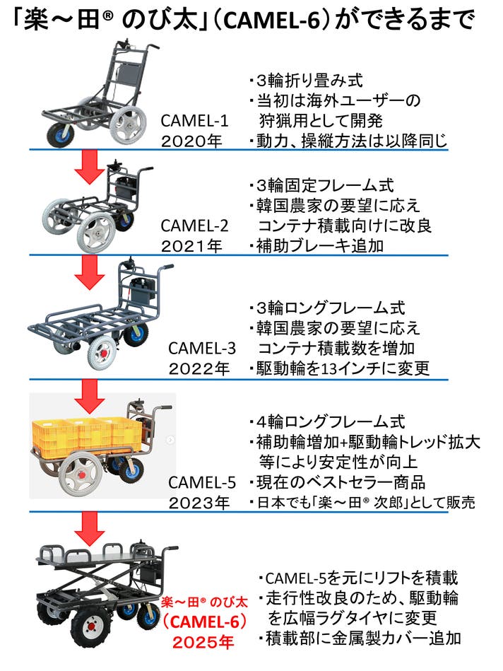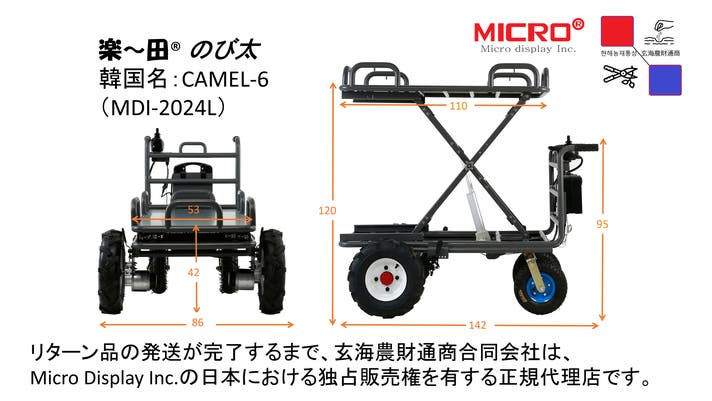 韓国電動運搬車の先駆者Micro Display Inc.が自信を持ってお届けするリフト搭載機種CAMEL-6(韓国では2025年3月新発売)が、Makuakeを通じて「楽~田® のび太」の名で日本デビューします!