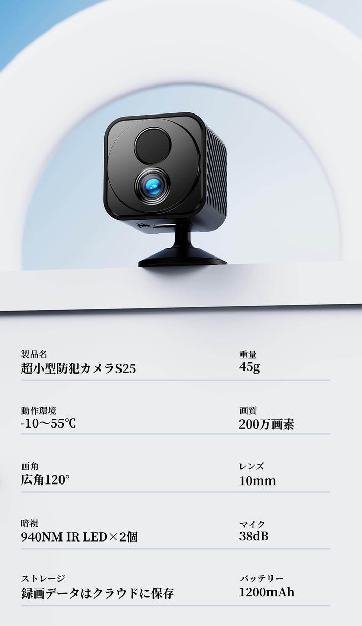 「超小型防犯カメラS25」ではシリーズ初の「動体検知専用モデル」として設計された防犯カメラです。