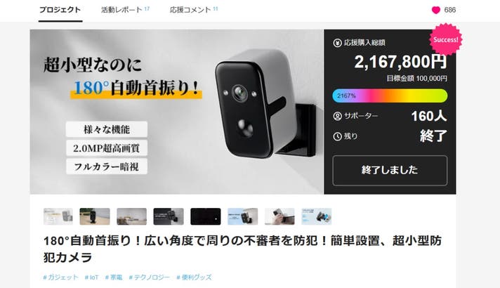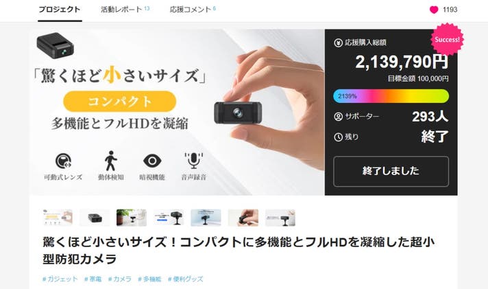 リターン品の配送が完了するまで、当社は「超小型防犯カメラS25」が日本における独占販売権を有する正規代理店です。詳細に関しては、ページ下部のリスク&チャレンジをご確認ください。