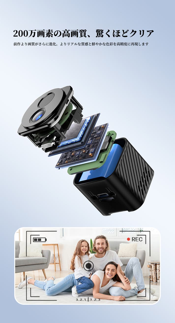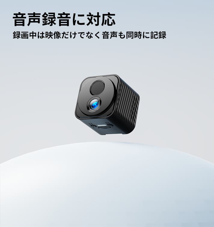 - 120°広角レンズで死角を減らす。音声録音&暗視機能&人検知機能も対応、超小型でも多機能を搭載