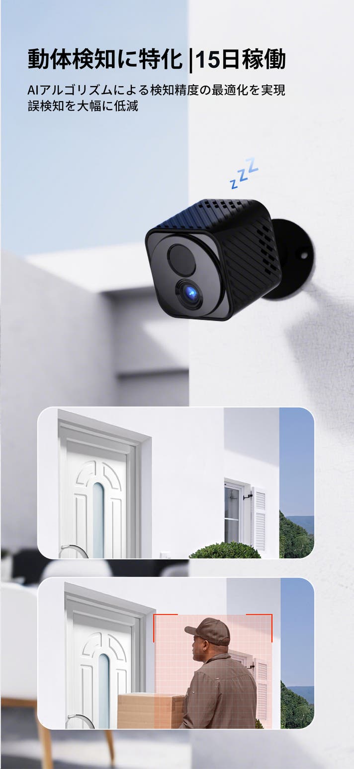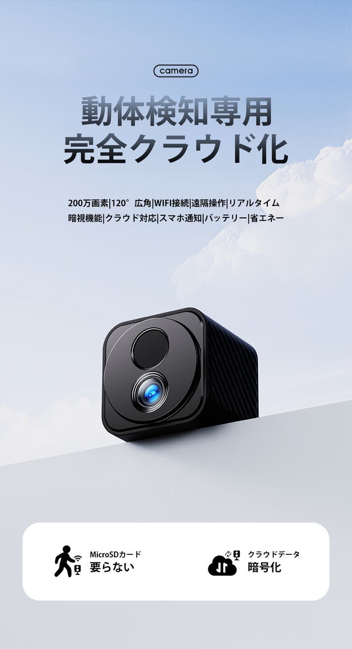 - MicroSDカード不要、録画はクラウドに保存、スマホから閲覧可能!人感特化の動体検知カメラ