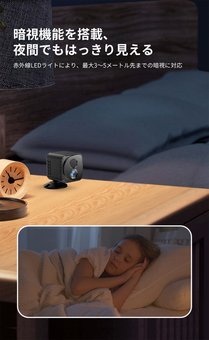 内蔵された赤外線LEDライトにより、真っ暗な場所でも明るく鮮明な映像を映し出します。最大3~5メートル先までの暗視に対応し、玄関や室内、倉庫など光の届かない場所でもしっかり監視可能です。