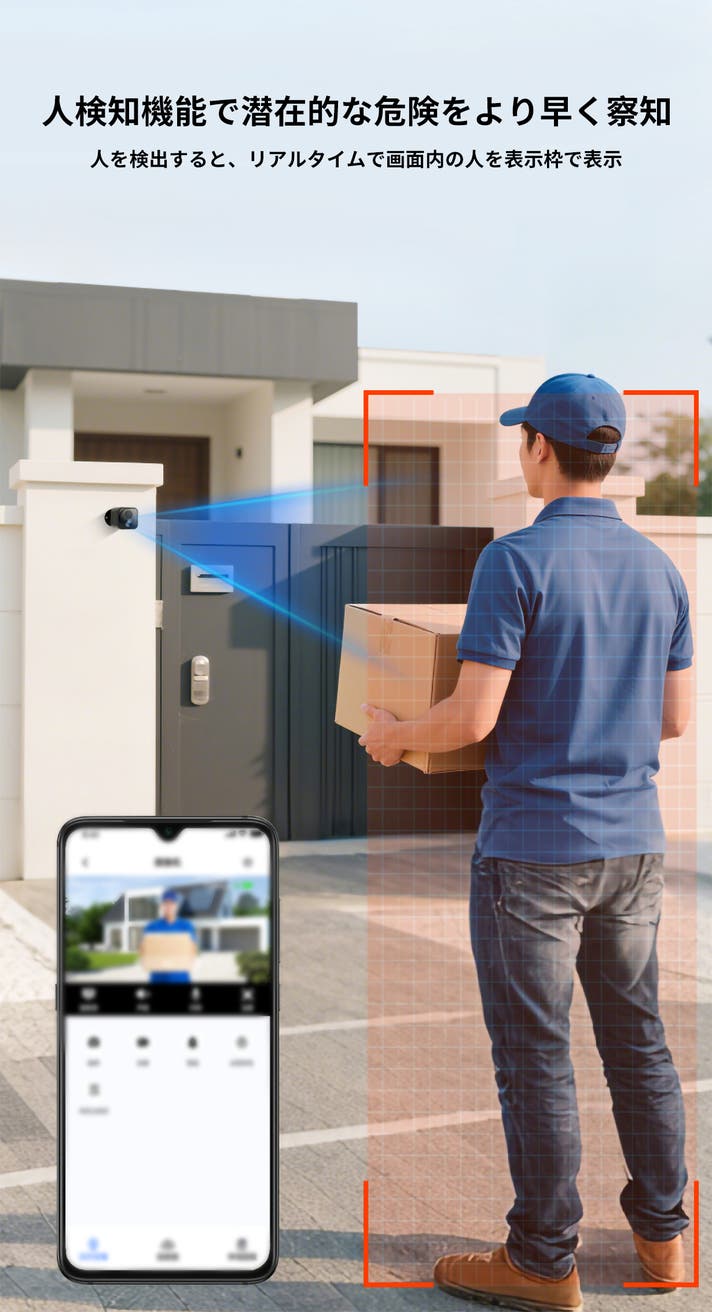 カメラの視野内で人や動物などの動きを感知した瞬間、自動で録画を開始し、スマホへ即座に通知を送信。外出先でもリアルタイムで状況を把握することができます。さらに、AIアルゴリズムによる検知精度の最適化を実現。動きの特徴やパターンを学習し、風や影などによる誤検知を大幅に低減。必要な映像だけを確実に捉えます。