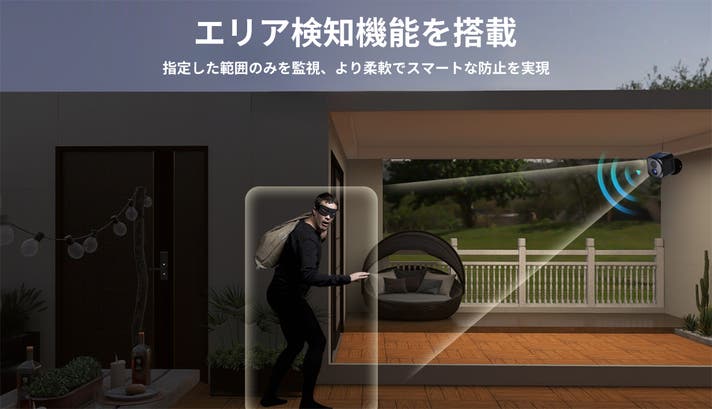 指定範囲検知機能も備えます。ドアや窓など、監視したいエリアをあらかじめ設定しておけば、その範囲に限定して検知・通知が行われます。無駄な通知を減らし、必要な場面にだけしっかり反応。より柔軟で効率的な防犯が可能です。