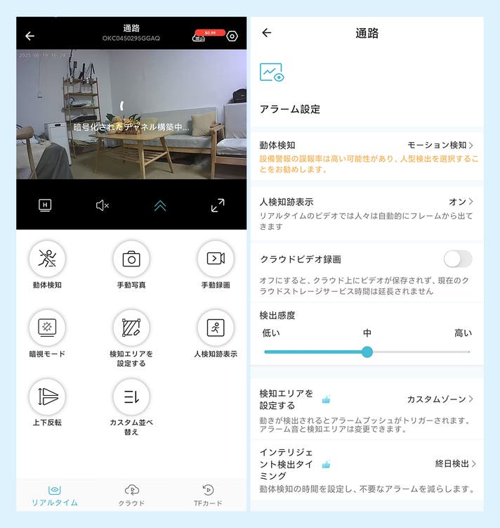 アプリには多彩な機能が搭載され、モード選択や通知設定などを使用シーンに合わせて自由にカスタマイズ可能です。録画データはクラウドに自動保存され、必要に応じて有料プランのクラウドサービスも利用できます。セキュリティ管理が、あなたのスマホひとつで完結。どこにいても、便利を手のひらに。