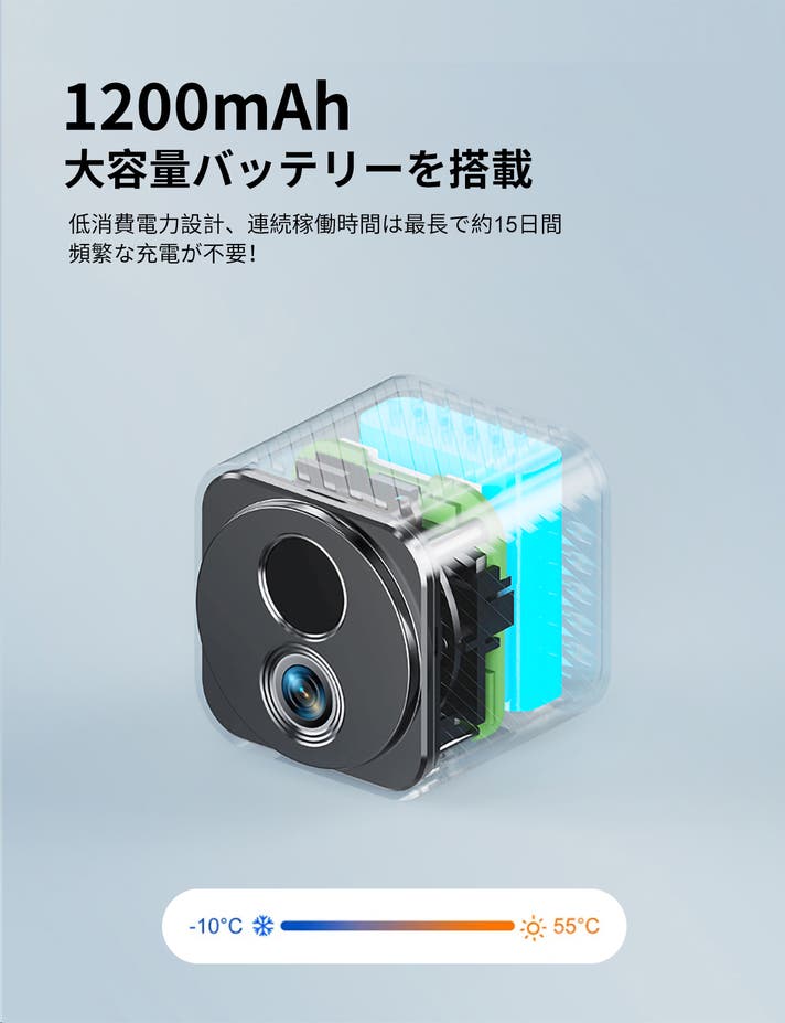 本体には1200mAhの大容量バッテリーを搭載しています。動体検知時のみ録画を行う低消費電力設計により、連続稼働時間は最長で約15日間(1日5回程度の検知を想定)。頻繁な充電が不要なため、庭先・店舗・倉庫など、長期間の防犯・見守り用途にも最適です。