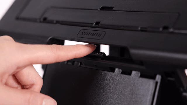 高さ調節の支持台を取り付けると自動固定され、上部のボタンを押すと解除し支持台を取り外すことができます。