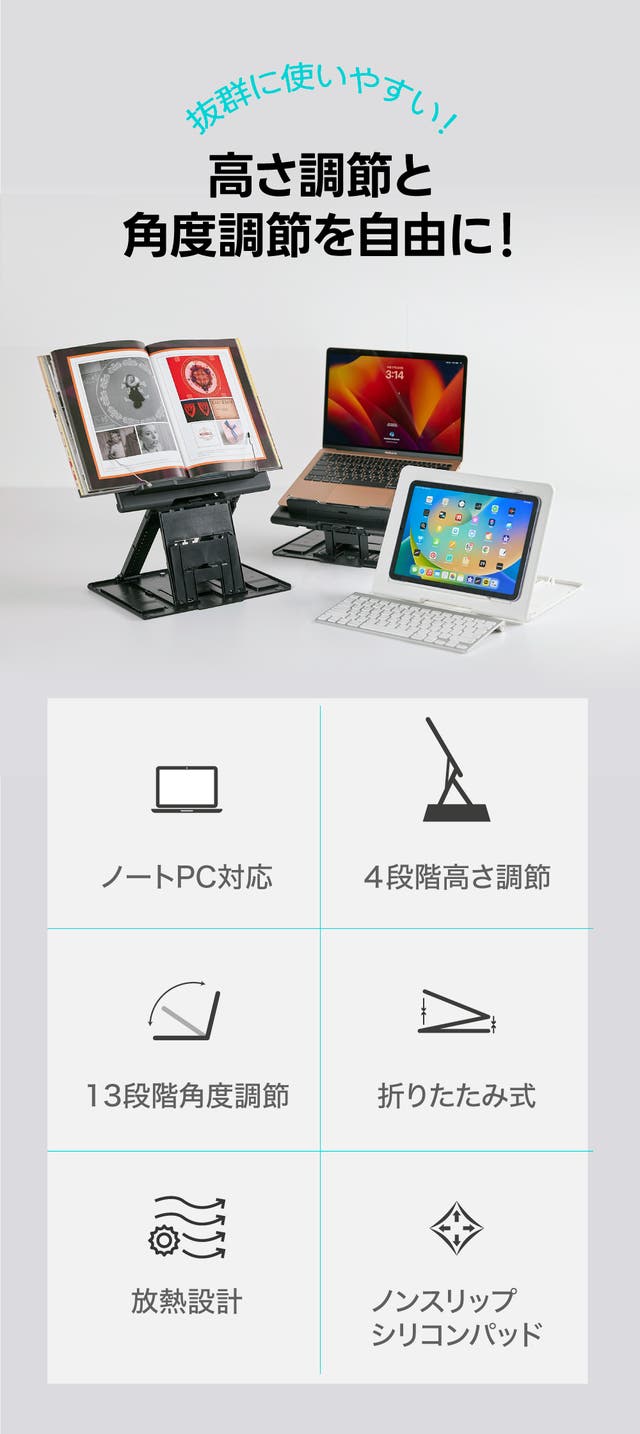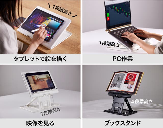 - ブックスタンド、タブレットやパソコンのスタンドまで。幅広い使い道でとても便利!