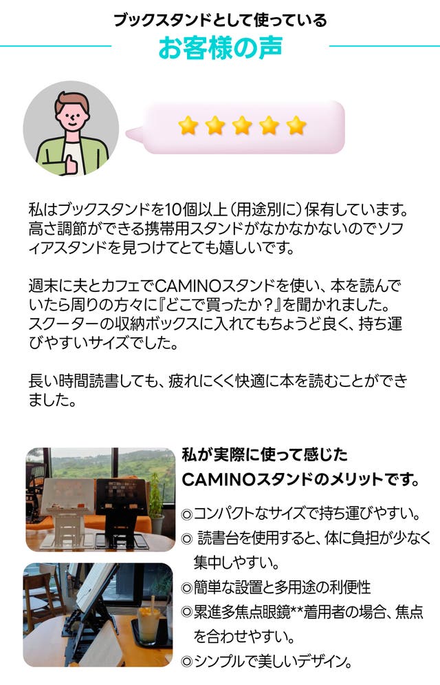 正しい目線で使用シーンに応じて楽に使える、軽くて利便性が良く故障しにくい使いやすいCAMINOを是非ご紹介したいと思いました。