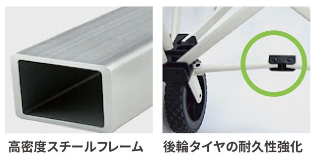 一般的なキャリーワゴンのタイヤはプラスチック製が多いのに比べ、キャンプ365のタイヤはゴム製です。 そのため、静音で耐久性が非常に良く長い間お使いいただけます。