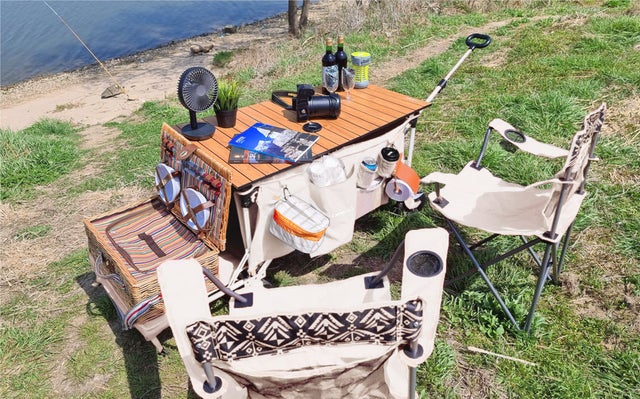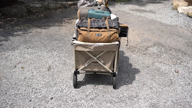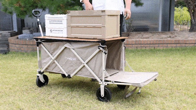 アウトドアチェアやクーラーボックスなどの大型で重量があるキャンプ用品をまとめて楽に運べるのに加え、荷物置き場としても活用できるのがメリットです。