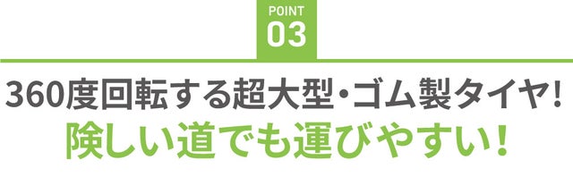 ●抜群の大きさを誇る「17.5cmの超ワイド」「360度回転」の丈夫なゴム製タイヤ!坂道・砂利道でも力を入れず、ラクラク運べます!