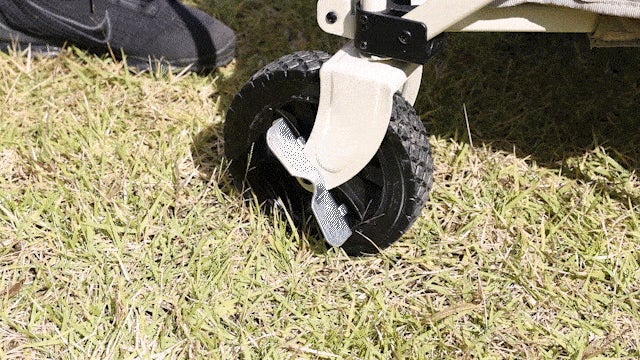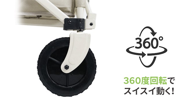 キャンプ365のキャリーワゴンのタイヤは直径17.5cm・幅3.5cmと他の物よりかなり大きく、360度回転します!
