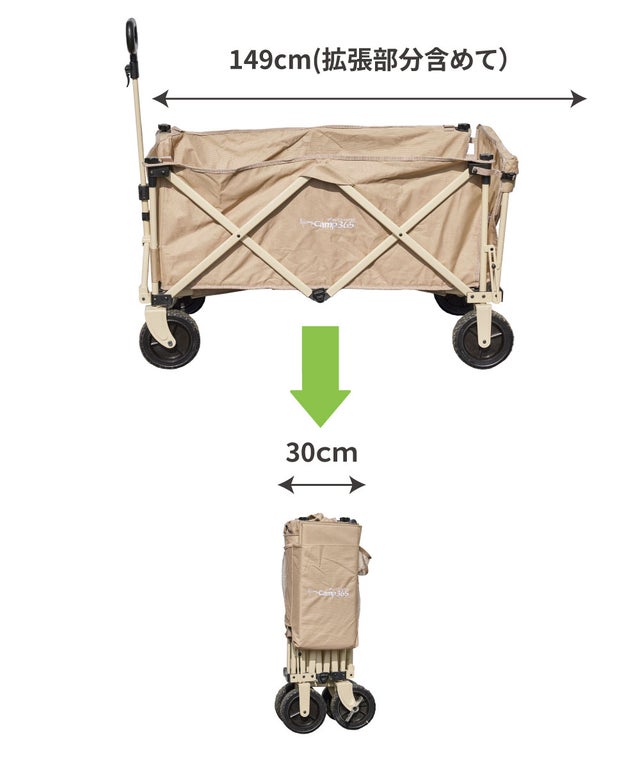 ●キャンプ365のキャリーワゴンは背面が拡張し、149㎝まで延長可能なので荷物の積載量が更にUPします!