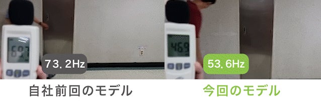 このようにい自社前回のモデルの場合は最大73.2Hzだったのに対し、今回のモデルは最大53.6Hzと音が小さいことが分かりました。