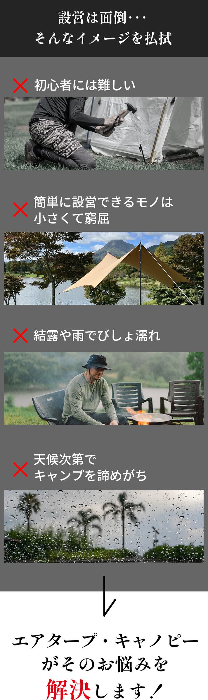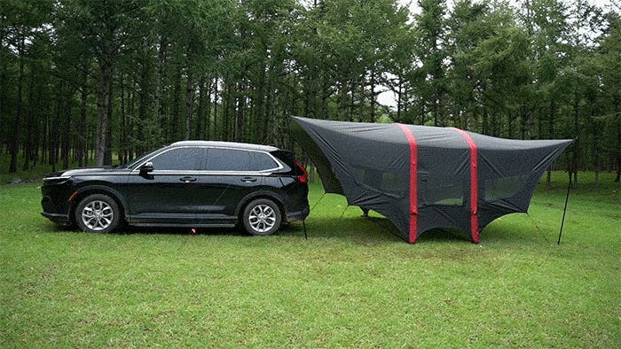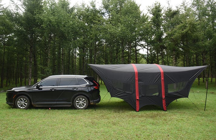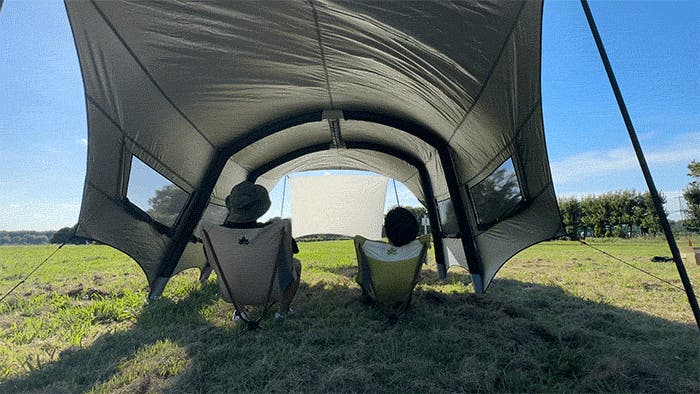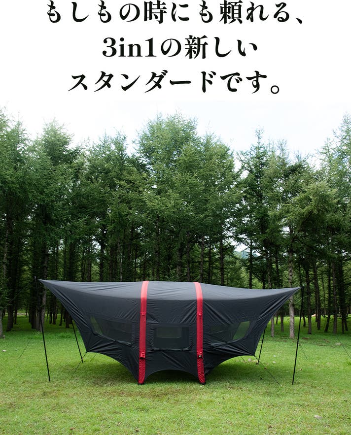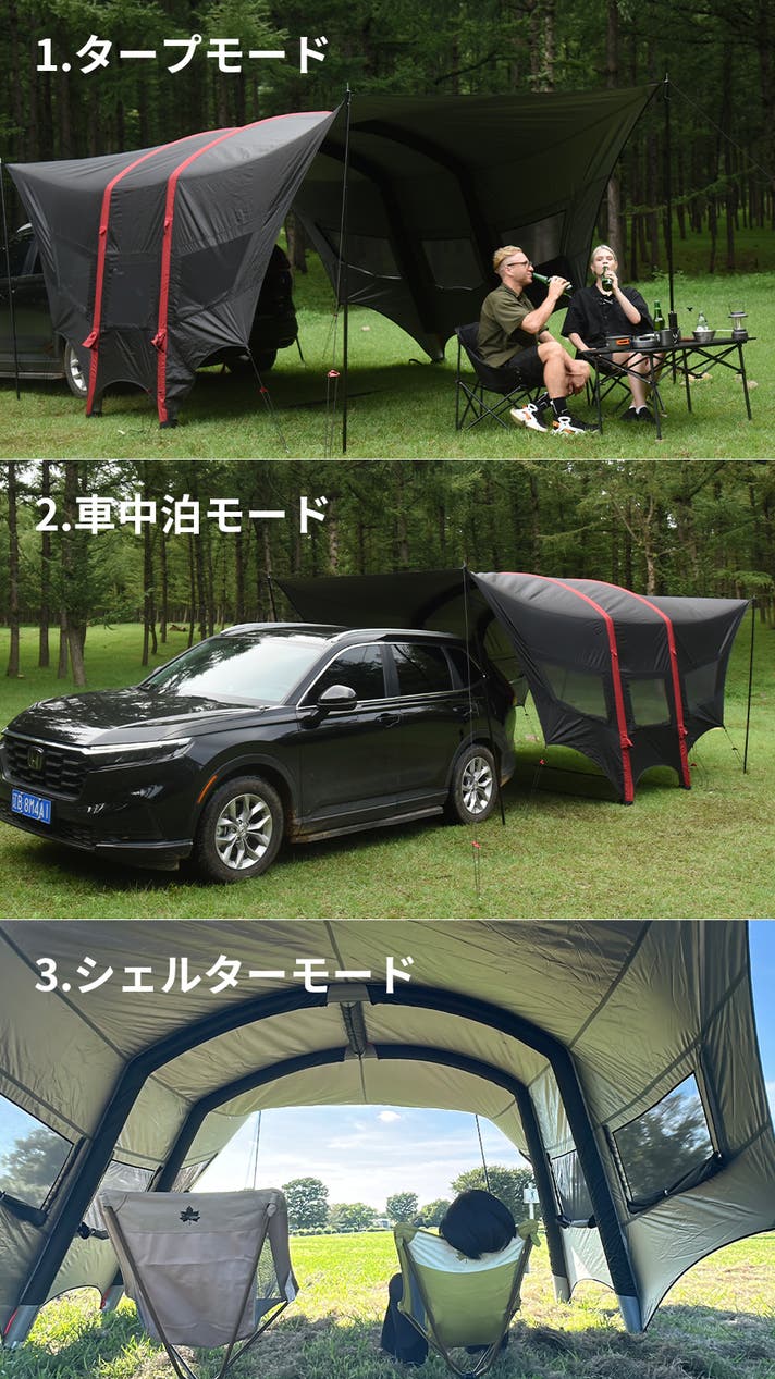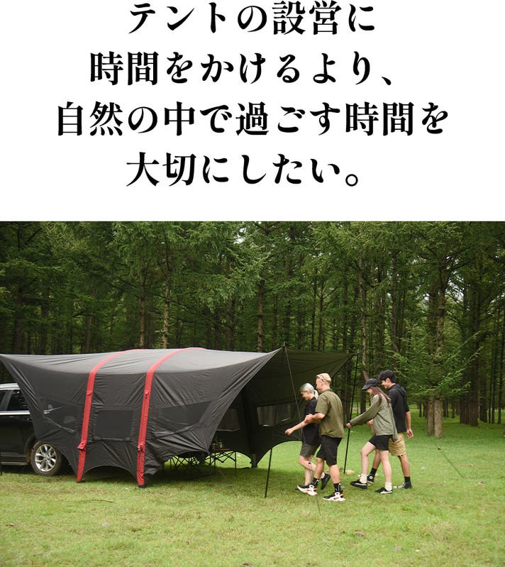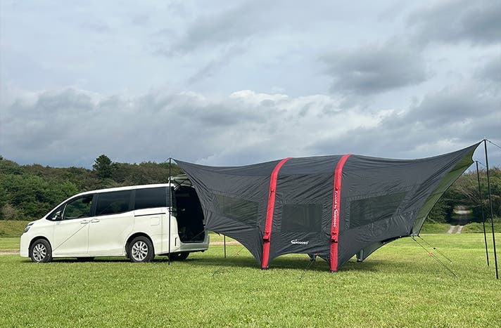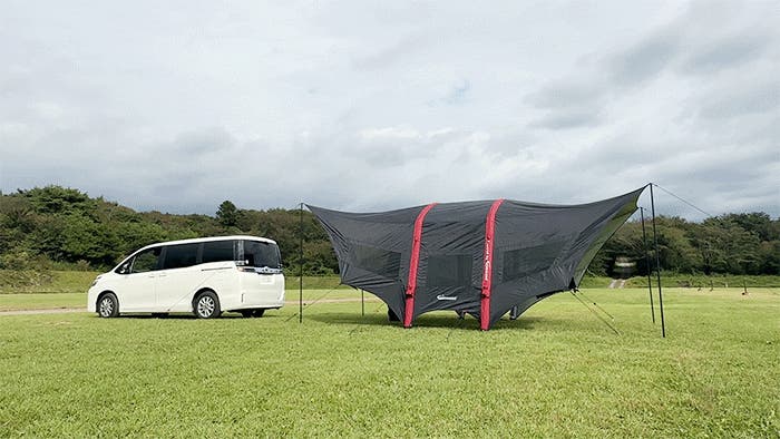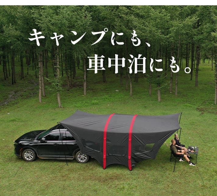 キャンプ時のタープとしてはもちろん、車中泊のリビングや、災害時のシェルターとしても活躍します。