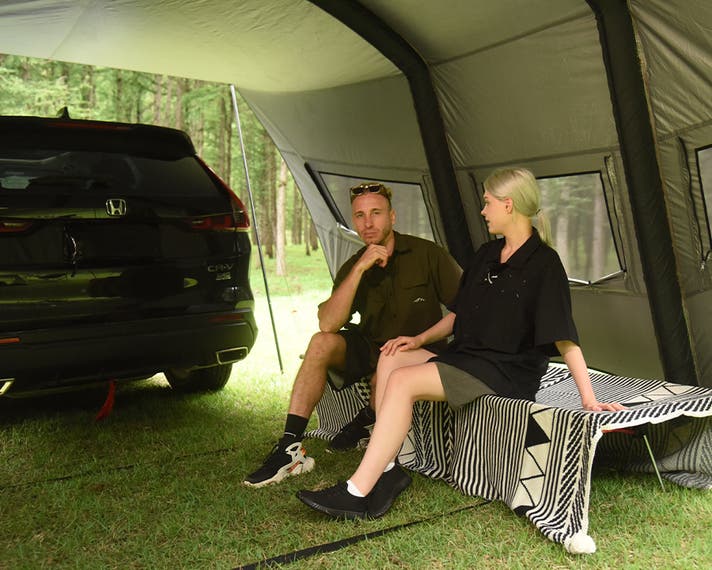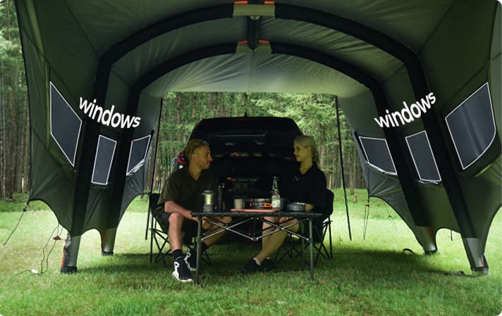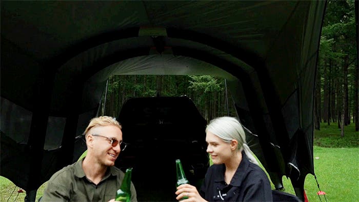 キャンプ時にはリビングとして、車中泊では寝室との間をゆるやかにつなぐ “もうひとつの居場所”をつくり出します。