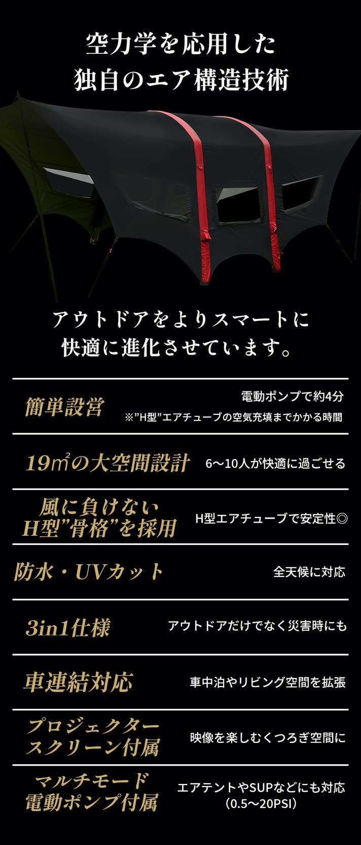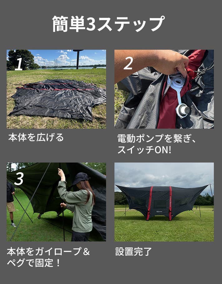 - 【スマート設営】約4分で“H型”エアチューブが立ち上がる。電動ポンプで簡単セットアップ!