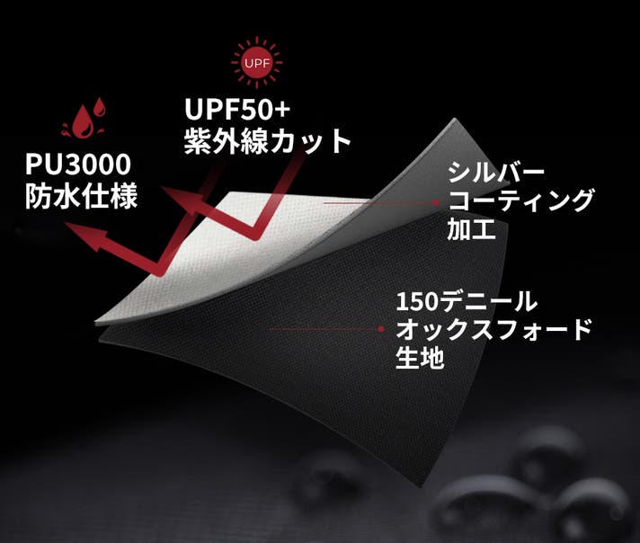 ブラックPUコーティング+シルバー裏地により、紫外線を98%以上カット(UPF50+)