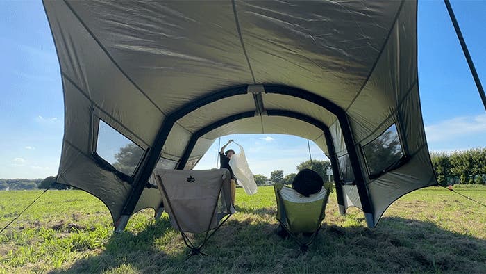 エアタープ・キャノピーは、電動ポンプで空気を注入するだけのシンプル設計。約4分で自立し、チェアやテーブルのレイアウトにすぐ移れます。