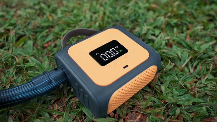空気圧は0.5~20 PSIまで幅広く対応し、6種類のユニバーサルノズルを付属。内蔵バッテリー(4000mAh×3)に加え、車の12V電源やポータブル電源でも使用可能です。