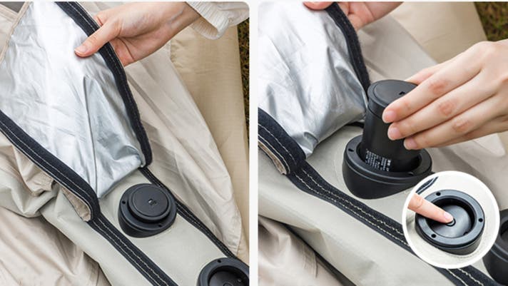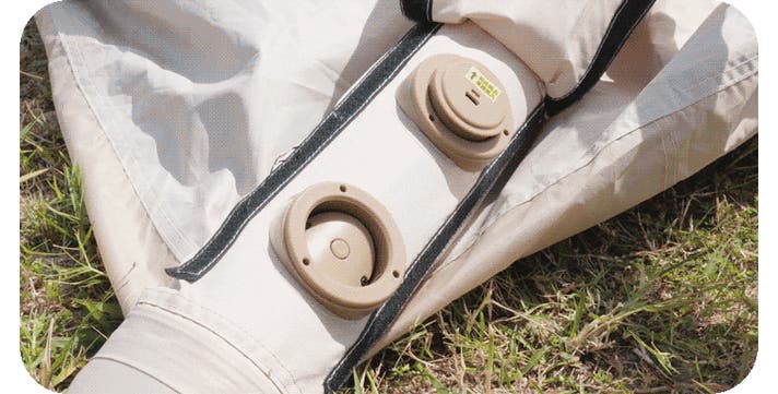 フレーム部にあるバルブに電動ポンプを繋げて空気を注入するだけで完成、一人でも設営・撤収が簡単にできます。