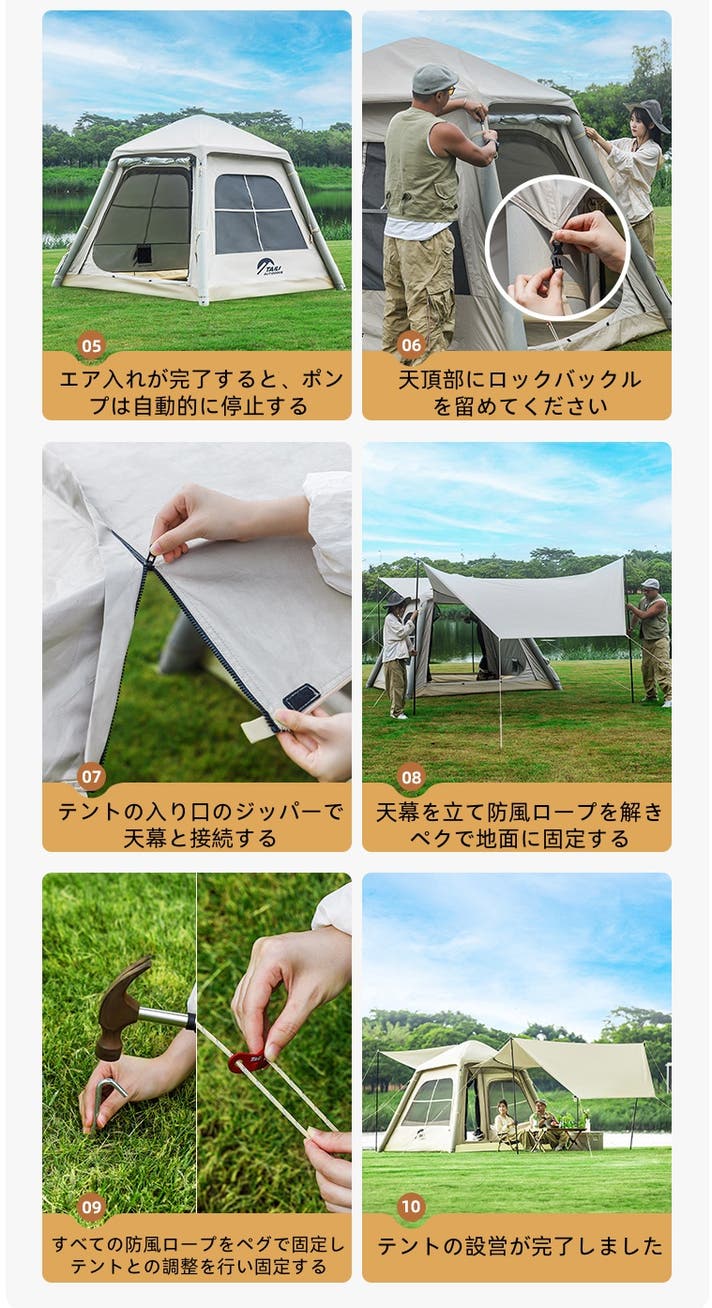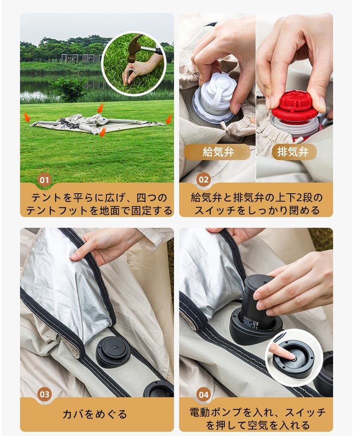 複雑な手順を覚えたり、重い部品を運んだりする必要はなく、付属する電動ポンプを使用すれば、スイッチ一押しの簡単操作で、テントは自動的に膨らみ、設定圧に達すると自動停止するので、短時間で安定した空間を作り上げます。