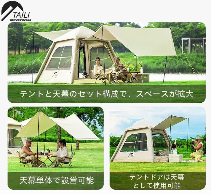 TAILIエアテントは内部空間が広く設計されており、複数人で使用しても窮屈さを感じることがなく、ゆったりとした休憩や活動が可能です。