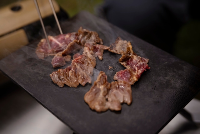 - ヘルシーでおいしい、焼き肉用ハラミ肉をアウトドア用にパッケージング